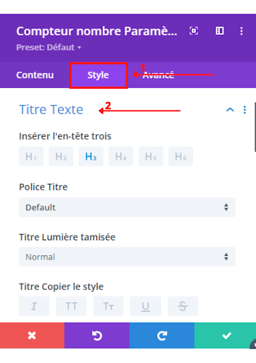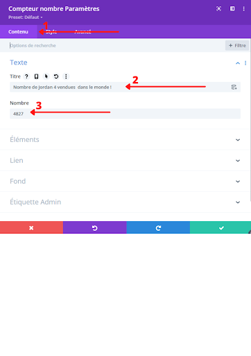 2. Dans “contenu” (point 1) vous avez la possibilité de changer le “texte” (point 2) et le “nombre”(point 3).