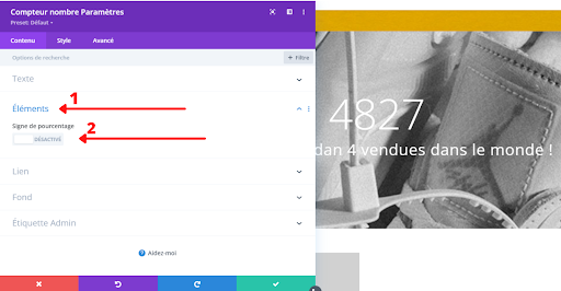 3. Dans “éléments” (point 1) vous pouvez activer ou bien désactiver le “signe de pourcentage”(point 2).