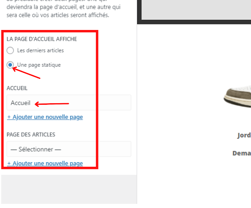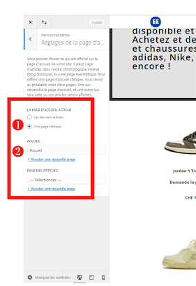 4. Cliquez “Une page statique”(point 1) et sélectionnez la page “Accueil”(point 2).