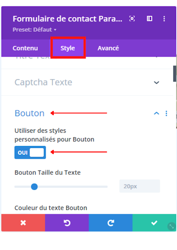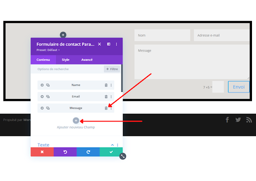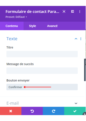7. Dans “contenu”, allez sur “texte” puis modifiez le nom du bouton dans “bouton envoyer”.