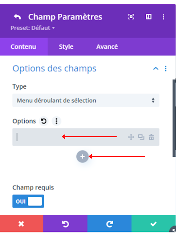 Pour la section pointure et méthode de paiement, il faut un champ qui offre la possibilité de plusieurs options. Pour cela il faut aller dans “options des champs” (Point 2).