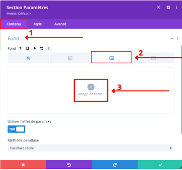 2. Dans “contenu” allez à la section “fond” (point 1), puis sélectionnez l’onglet « image » (point 2) pour ajouter une image de fond (point 3).