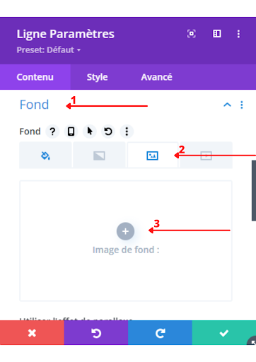 4. Dans “fond” (point 1) choisissez le troisième onglet pour ajouter une image de fond (point 2) puis sélectionner l’image (point 3).