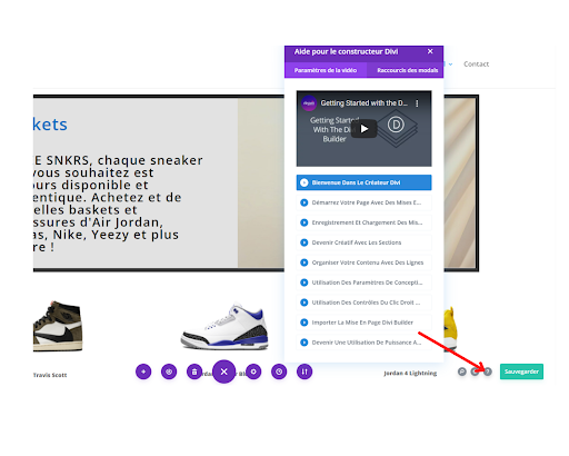 Ensuite, à la gauche de « Sauvegarder », vous avez une option avec un petit point d’interrogation “?”. Cette option vous propose plusieurs vidéos qui peuvent vous aider concernant le constructeur Divi .