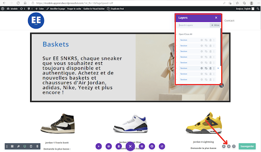 En appuyant sur les trois petits points violets, vous pouvez ouvrir le menu des layers. Ce menu vous donne accès à plusieurs options concernant les différentes visions de la page.