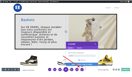 Maintenant parlons des options violettes au milieu. En commençant par la droite, vous avez une option avec deux flèches. Cette option appelée “Portabilité”, vous permet d’exporter la mise en page Divi Builder que vous avez faite ou d’importer une mise en page proposée par le site.